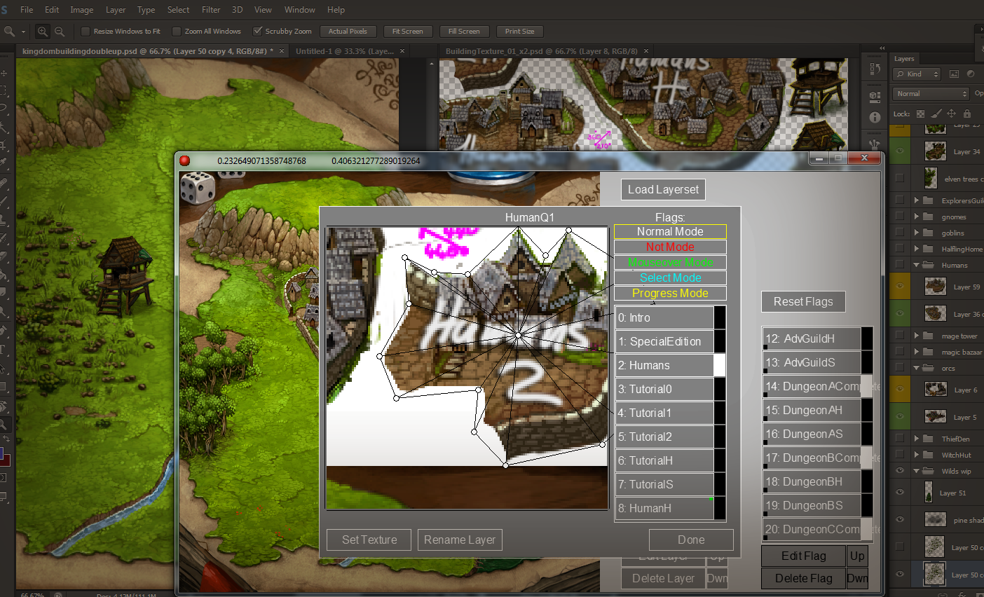 Blog image this time around comes from our in-house artist’s work environment (click for full size if you feel like it). She reports having to turn her Photoshop environment into some kind of Frankensteinian horror to deal with our layer-editing demands on the newer-and-prettier Kingdom screen. And now — quick changelog? Yep, quick changelog: